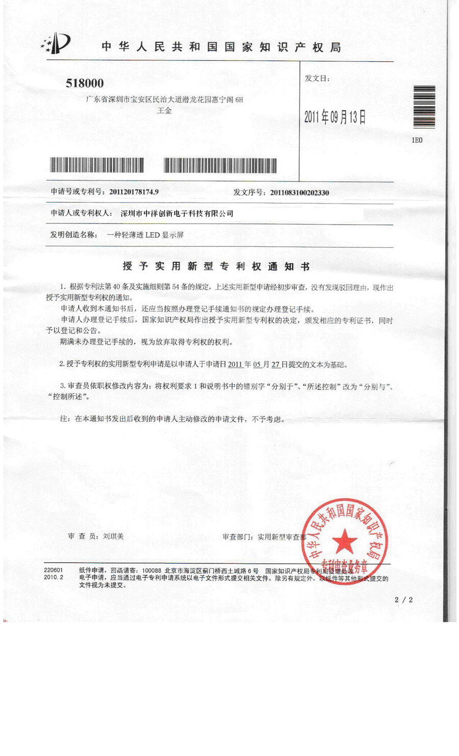 中祥創(chuàng)新為避免公司技術(shù)成果流失,于近日向國(guó)家知識(shí)產(chǎn)權(quán)局申請(qǐng)兩項(xiàng)新的外觀設(shè)計(jì)專利,再獲受理。此兩項(xiàng)專利主要應(yīng)用于公司低碳環(huán)保節(jié)能led顯示屏以及輕薄透led顯示屏,中祥創(chuàng)新對(duì)此擁有完全自主知識(shí)產(chǎn)權(quán)。