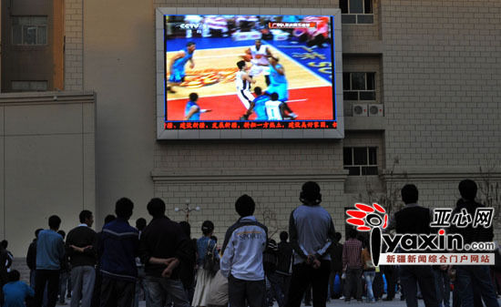 4月22日20時(shí)許,新疆農(nóng)業(yè)大學(xué)2號(hào)教學(xué)樓門前六七百平方米的開(kāi)闊地帶,五六百名以學(xué)生為主體的球迷齊刷刷地將目光聚焦到該樓外墻上的led顯示屏上,屏幕上正在直播2010-2011賽季中國(guó)男籃CBA總決賽廣東隊(duì)對(duì)陣新疆隊(duì)的第四場(chǎng)比賽。