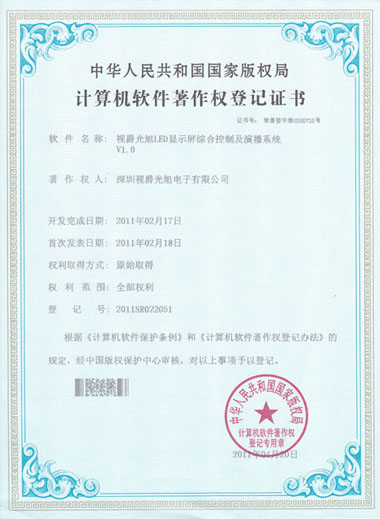 日前,視爵光旭喜獲led顯示屏綜合控制及演播系統(tǒng)V1.0著作權(quán)登記證書,登記號(hào)2011SR022051,這是視爵光旭全體人員辛苦努力的結(jié)果,標(biāo)志視爵光旭在LED控制軟件研發(fā)又邁出堅(jiān)實(shí)的一步!