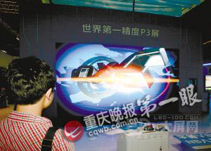 進(jìn)入1號(hào)館A區(qū),一塊特大高清“巨無霸”顯示屏正在播放美國好萊塢大片《冰河世紀(jì)》,這是全球電子巨頭富士康科技集團(tuán)帶來的P3屏,也是全世界最大分辨率全彩色LED顯示屏。
