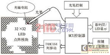 本文采用PIC 16F877A單片機為主要核心控制元件,設計了一個32×32 LED點陣模塊的書寫顯示屏。它主要由光筆模塊和點陣顯示模塊組成,光筆模塊利用光敏電阻的光電特性,實現(xiàn)微亮檢測功能。光筆反饋信號經(jīng)放大器LM324比較后,送給單片機處理。32×32點陣顯示模塊、驅動模塊由74HC595外設驅動陣列和8位串行輸入/輸出移位寄存器ULN2803A組成。光筆通過顯示屏微亮掃描尋找坐標值,按鍵和LED指示燈可實現(xiàn)“點亮、劃亮、反顯、整屏擦除、筆畫擦除、連寫多字、對象拖移”等書寫顯示功能。