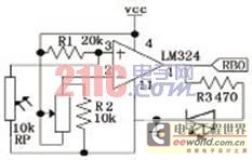 光筆選用光敏電阻作為感應器件,根據(jù)光敏電阻的光電特性,光敏電阻兩瑞電壓因光電阻的變化而變化。電壓值經(jīng)電壓比較器LM324比較后可輸出高/低電平。光電特性非線性易調節(jié),且靈敏度較好。