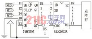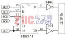 32×32點陣led顯示屏共有32個端口,如不驅動點陣,占用單片機I/O過多。這里采用74HC595(八外設驅動陣列)、ULN2803A(8位串行輸入/輸出移位寄存器)點陣行驅動和74HC154、7404點陣列驅動。共同完成32×32點陣led顯示屏驅動。顯示屏行驅動電路如圖5所示、列驅動電路圖如圖6所示。僅僅用到8個I/O口,點用資源少,易控制并且顯示效果很好。
