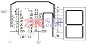 根據(jù)題目要求,在“點亮”功能下,光筆接融到顯示屏某點時,控制板同步顯示該點的坐標值。坐值標為數(shù)字,所以可采用四個數(shù)碼管作為顯示器件。采用74LS164擴展單片機I/O口,其電路如圖7所示。共有四套這樣的電路,其中兩套用于X軸顯示,另外兩套用于Y軸顯示。