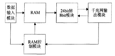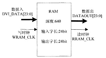 其中,數(shù)據(jù)輸入和寫時(shí)鐘分別為DVI解碼芯片解碼后的24bit圖像數(shù)據(jù)DVI-DATA [23:0]和時(shí)鐘WRAM_CLK,讀RAM 的時(shí)鐘為千兆網(wǎng)時(shí)鐘RMll-CLK (125M) 三分頻后得到的時(shí)鐘RRAM-CLK(41.66MHz),這樣,后端再通過一個(gè)24bit轉(zhuǎn)8bit模塊即可將數(shù)據(jù)進(jìn)行實(shí)時(shí)傳輸。
