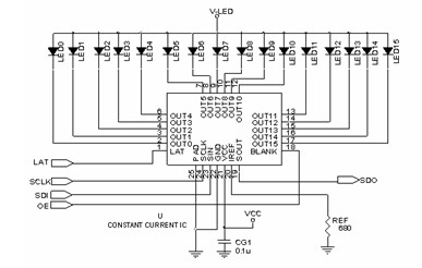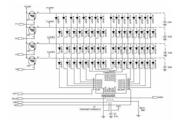 led顯示屏的模塊驅(qū)動電路,一般包括靜態(tài)和動態(tài)驅(qū)動兩種電路拓撲,如圖一和圖二。圖像(視頻)信號通過控制器將控制信號進行串行編碼后,串行圖像數(shù)據(jù)(OE,LAT,SDI,SCLK及SDO)通過恒流IC級聯(lián)的方式進行傳輸分配,恒流IC將串行圖像信號進行串并轉(zhuǎn)換后去驅(qū)動LED點陣中的每位LED燈管;LED燈管正端供電電壓正常條件下,恒流驅(qū)動IC的輸出通道在有效圖像位驅(qū)動信號的作用下進行開啟和關斷,從而達到驅(qū)動LED點亮和熄滅的功能;恒流驅(qū)動IC的電流通過外置電阻REF來調(diào)節(jié),通過改變REF的值來實現(xiàn)電流大小的調(diào)整。