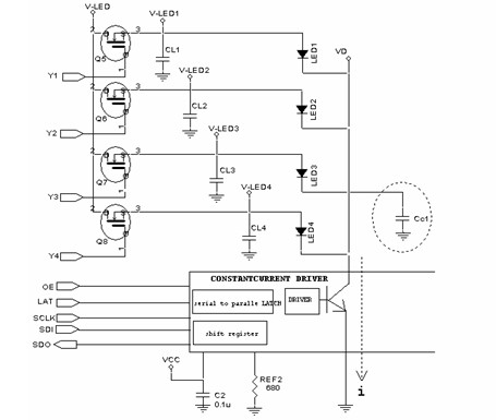 如圖六所示,4掃的點陣模塊的行電源通過4個LED連接到恒流信號的輸出通道上,當V1(V2,V3或V4)減去VD的值大于LED的正常開啟值時,LED將點亮。
