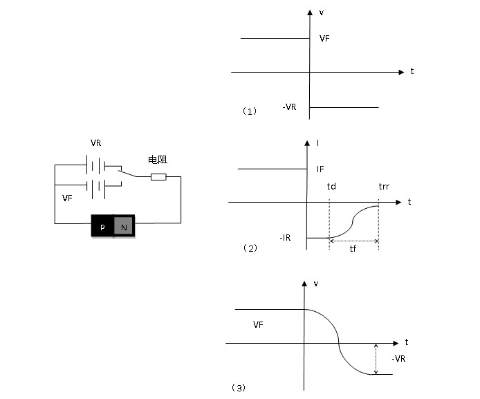 由于二極管內(nèi)部的勢壘電容的擴散電容的作用下,反向電流上升率與結(jié)溫,及開關前的正向電流等因素有關。反向恢復時間trr是延遲時間td與下降時間tf之和,其對二極管的工作頻率具有決定性的作用,限制了開關速度。同樣正向恢復時間也限制了正向電流上升速率和開關速度。