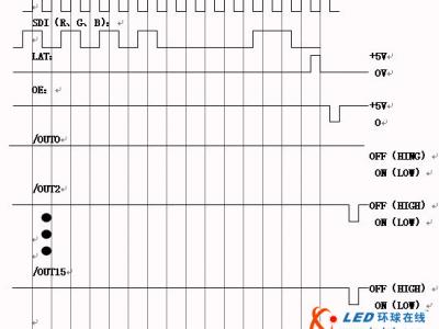 如圖三,每一個(gè)LED單管都是獨(dú)立可控的,當(dāng)開關(guān)閉合時(shí),電流從行電源,經(jīng)LED,開關(guān)到地,從而點(diǎn)亮;開關(guān)斷開時(shí),LED熄滅。LED陣列就是由相應(yīng)的開關(guān)陣列(控制器+恒流芯片)控制,控制信號(hào)由LED圖像(視頻)控制系統(tǒng)邏輯產(chǎn)生?刂七壿嬕罁(jù)結(jié)構(gòu)定義信號(hào)的意義,獨(dú)立控制各個(gè)LED.開關(guān)陣列可以采用各種形式,一般用電子開關(guān)(恒流驅(qū)動(dòng)IC),甚至可以是控制邏輯中的一部分。串行邏輯不但接口簡單,而且容易級(jí)聯(lián)(SDI和SDO),組成更大的陣列,所以使用更為廣泛。驅(qū)動(dòng)模塊的恒流芯片采用串行方式,內(nèi)部設(shè)置串行、并行兩組寄存器,通過時(shí)鐘SCLK將數(shù)據(jù)串行輸入模塊,通過鎖存信號(hào)LAT將串行數(shù)據(jù)存入并行寄存器,同時(shí)通過OE使能信號(hào)驅(qū)動(dòng)更新屏體顯示。