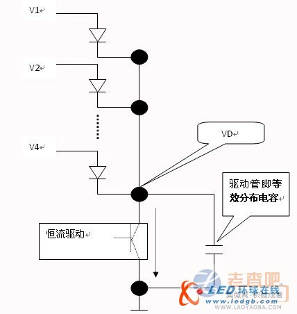 如圖六所示,4掃的點陣模塊的行電源通過4個LED連接到恒流信號的輸出通道上,當V1(V2,V3或V4)減去VD的值大于LED的正常開啟值時,LED將點亮。