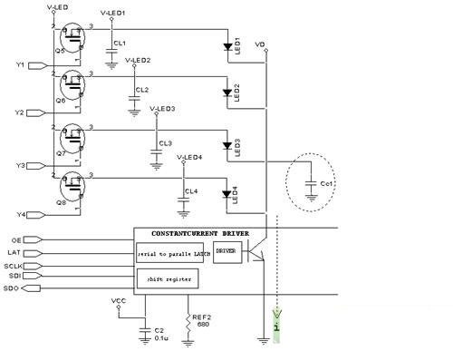 圖三 led顯示屏動態(tài)1/4掃恒流驅動通道電流和電壓示意拓撲圖