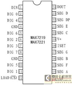 Maxim公司的MAX7219芯片用于動態(tài)掃描顯示驅(qū)動,芯片內(nèi)有可存儲顯示信息的8x8靜態(tài)RAM、動態(tài)掃描電路以及段、位驅(qū)動器。它與通用微處理器有3根串行線相連,最多可驅(qū)動8個共陰數(shù)碼管或64個發(fā)光二極管。采用MAX7219芯片實現(xiàn)LED數(shù)碼顯示,具有電路緊湊、可節(jié)省CPU的I/O接口、芯片功能強大、編程簡單等優(yōu)點,得到了廣大電路設(shè)計者認可。然而MAX7219的工作電壓為5V,共陰極LED顯示驅(qū)動,只適用于3.5V以下電壓驅(qū)動的LED數(shù)碼管,限制了其使用范圍。