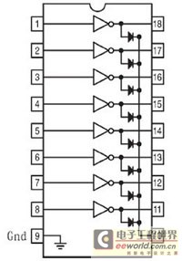 ULN2803是摩托羅拉公司生產(chǎn)的具有高電壓、大電流的8路達林頓驅(qū)動器,廣泛應用于計算機、工業(yè)和消費類產(chǎn)品中。管腳連接見圖2所示,引腳1~8為8路輸入端,TTL電平驅(qū)動,引腳11~18為對應的8路集電極開路輸出口,上掛負載,最大工作電壓50V,驅(qū)動電流可達500mA,引腳10為COM端,當上掛電阻性負載時,引腳10開路;當上掛電感性負載時,引腳10接負載電源,構(gòu)成在每個感性負載兩端并聯(lián)一個續(xù)流二極管以防止反電勢擊穿器件。