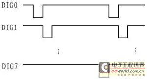 MAX7219工作時,在內(nèi)部硬件動態(tài)掃描顯示控制電路作用下,實現(xiàn)動態(tài)顯示。DIG0~DIG7引腳接8位數(shù)碼管的公共端,其信號時序見圖4。當輸出數(shù)碼管位選信號DIG0~DIG7某位為低電平時,段碼線SEGA~SEGG和SEGDP輸出數(shù)據(jù)為所要顯示段碼,并驅(qū)動共陰極LED,實現(xiàn)8位數(shù)碼管動態(tài)循環(huán)顯示。