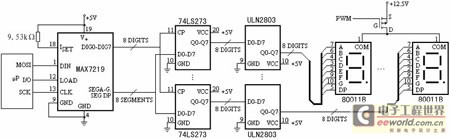 MAX7219在內(nèi)部硬件動態(tài)掃描顯示控制電路作用下,實現(xiàn)LED數(shù)碼管動態(tài)顯示。在本電路中采用74LS273觸發(fā)器鎖存各數(shù)碼管的段碼驅(qū)動信號,當MAX7219動態(tài)掃描完成一個周期后,可通過微處理器,控制MAX7219工作在休眠狀態(tài),即不工作方式。此時數(shù)碼管為靜態(tài)顯示方式,通過74LS273鎖存的數(shù)據(jù),由ULN2803驅(qū)動數(shù)碼管顯示。電路實現(xiàn)MAX7219間歇工作,只有在數(shù)碼管顯示改變的情況下,啟動MAX7219工作,完成數(shù)據(jù)更新鎖存后,進入不工作狀態(tài),以節(jié)省功耗。
