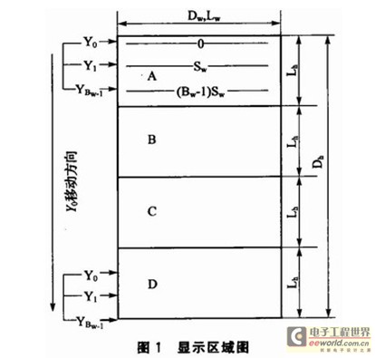 需要顯示的區(qū)域小于或等于實(shí)際顯示區(qū)域時(shí),采用靜態(tài)顯示即可。但大多時(shí)候需要顯示的區(qū)域大于或等于實(shí)際顯示區(qū)域,如圖1所示。為了簡(jiǎn)化問題的分析,本文將顯示區(qū)域高度設(shè)置為led顯示屏高度的4倍,寬度等于led顯示屏寬度。設(shè)顯示屏的高度為L(zhǎng)h,寬度為L(zhǎng)w,則顯示區(qū)域高度Dh=4Lh,寬度Dw=Lw。本文以單色顯示作為描述對(duì)象,且Bw=Bn=8(Bw為掃描線條數(shù),Bn為輸出數(shù)據(jù)寬度),如圖1所示。