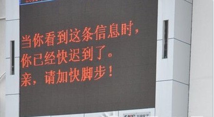 近日有張圖片在網(wǎng)上流行著,是一家學(xué)校的led顯示屏。上面顯示著“當(dāng)你看到這條信息的時(shí)候,你已經(jīng)塊遲到了。親,請(qǐng)加快腳步”。在俏皮的同時(shí),我們感受到更多的溫情。