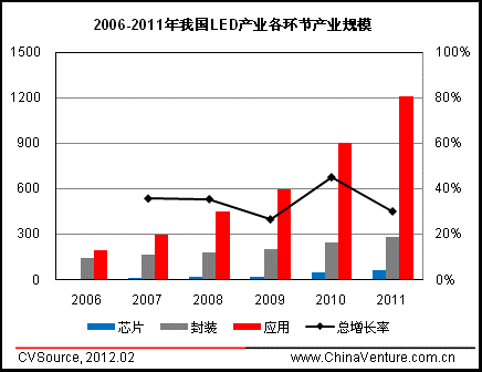 根據(jù)國家半導(dǎo)體照明工程研發(fā)及產(chǎn)業(yè)聯(lián)盟(CSA)的數(shù)據(jù)顯示,2011年我國LED行業(yè)總規(guī)模達(dá)到1560億元,同比增長(zhǎng)30%,增速略有放緩。ChinaVenture投中集團(tuán)分析認(rèn)為,與其它新興行業(yè)一樣,LED行業(yè)目前正經(jīng)歷著階段性產(chǎn)能過剩的陣痛。暫時(shí)困境難掩光明未來,在節(jié)能減排的大背景下,作為低耗能、低排放的典范,LED 照明行業(yè)投資機(jī)會(huì)凸顯。相關(guān)企業(yè)應(yīng)加大研發(fā)投入、突破產(chǎn)業(yè)核心技術(shù)、不斷降低生產(chǎn)成本、提升產(chǎn)品性價(jià)比,使LED照明在更多領(lǐng)域應(yīng)用普及。同時(shí),國家相關(guān)部門應(yīng)盡快出臺(tái)行業(yè)標(biāo)準(zhǔn)及相關(guān)扶持政策,從政策上引導(dǎo)LED行業(yè)朝著更加健康有序的方向發(fā)展。