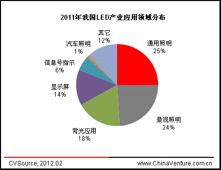 LED應(yīng)用市場(chǎng)分為通用照明、景觀照明、背光源、顯示屏和汽車照明等多個(gè)領(lǐng)域。2011年我國LED應(yīng)用領(lǐng)域的整體規(guī)模達(dá)到1210億元,同比增長(zhǎng)34.44%,是整個(gè)LED產(chǎn)業(yè)鏈中增長(zhǎng)最快的環(huán)節(jié)。其中,通用照明增長(zhǎng)最為明顯,整體份額已經(jīng)達(dá)到25%,成為市場(chǎng)份額最大的應(yīng)用領(lǐng)域,景觀照明、背光應(yīng)用緊隨其后(見圖3)。
