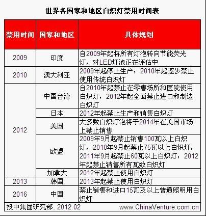 近年來,隨著LED行業(yè)的發(fā)展、產(chǎn)品成本不斷下降,LED照明應(yīng)用領(lǐng)域迎來較好的發(fā)展機(jī)遇。同時(shí),各個(gè)國家和地區(qū)對(duì)節(jié)能減排的積極態(tài)度,對(duì)白熾燈產(chǎn)品的停產(chǎn)和禁用計(jì)劃,也是推動(dòng)LED照明領(lǐng)域發(fā)展的重要因素(見表2)。