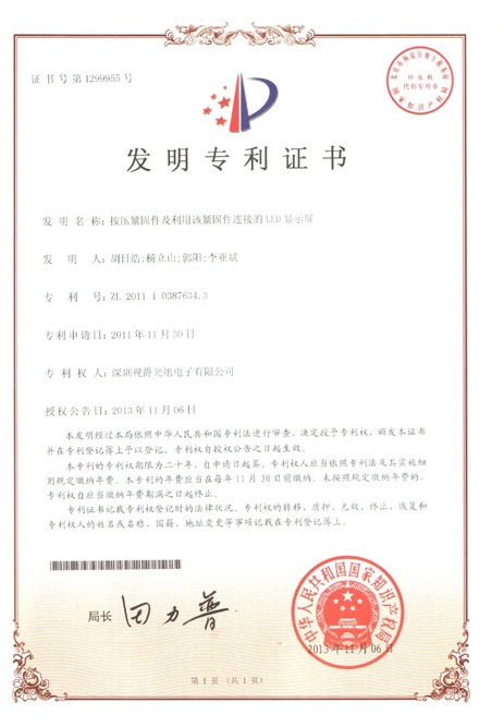 由視爵光旭工程師完成設(shè)計(jì)《按壓緊固件及利用該緊固件連接的LED顯示屏》近日取得了中華人民共和國(guó)國(guó)家知識(shí)產(chǎn)權(quán)局頒發(fā)的發(fā)明專利證書(shū)。