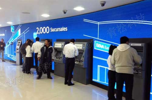由青松科技承建的室內(nèi)弧型全彩LED顯示屏在墨西哥城的PERISUR商業(yè)區(qū)成功安裝。該屏安裝在墨西哥BBVA Bancomer銀行內(nèi),采用Zeus SMD 6mm模塊,箱體通過ETL認(rèn)證。顯示屏擁有環(huán)路備份和色彩校正,校正數(shù)據(jù)存儲在模塊,用戶可隨時(shí)讀取校正數(shù)據(jù)保持一致性。在這塊弧形的LED顯示屏外墻有數(shù)塊嵌入式ATM機(jī),圖為用戶在這塊全彩LED顯示屏前操作ATM。顯示屏在展示商業(yè)信息的同時(shí),也使得人們可以享受ATM等待時(shí)間。