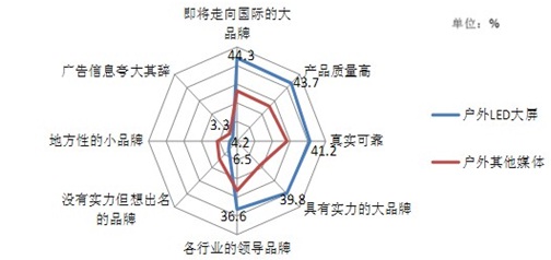 我們的研究發(fā)現(xiàn),戶外LED大屏能夠有效提升受眾對(duì)品牌的認(rèn)知和態(tài)度,針對(duì)戶外媒體,受訪者更傾向于認(rèn)為戶外LED大屏上播放廣告的品牌是具有實(shí)力的大品牌以及各行業(yè)的領(lǐng)導(dǎo)品牌等(見圖1)。