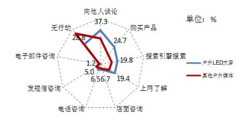 接觸戶外LED大屏廣告后,受眾行為受到廣告影響,產(chǎn)生后續(xù)的行為意向,其中,近20%會(huì)上網(wǎng)主動(dòng)搜索相關(guān)信息,6.7%會(huì)直接進(jìn)店咨詢,24.7%會(huì)嘗試購(gòu)買該產(chǎn)品,還有37.3%會(huì)向他人傳遞或主動(dòng)討論相關(guān)產(chǎn)品資訊,形成二次傳播(見圖3)。