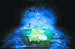 屏幕全面亮起,眼前的地面上,一塊波光粼粼的水面緩緩顯現(xiàn),一幅立體園區(qū)規(guī)劃圖從水面升起。原來,剛才看到的這一切,全都是屏幕顯示出的虛擬電子影像。