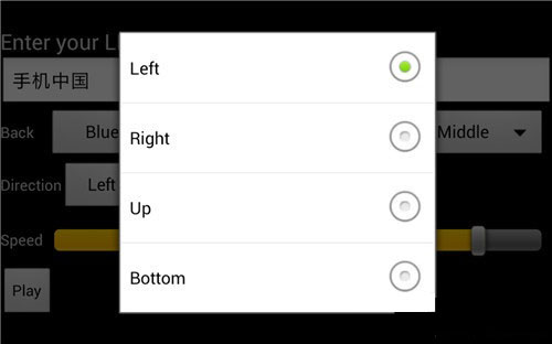 因為是滾屏,您需要選擇文字滾動的方向,上下左右隨您喜好,還能更改文字滾動的快慢,如果這段話比較長,不妨把速度加快一些方便觀看的人閱讀。字體可以調(diào)節(jié)大小,最佳顯示效果是“Middle”,如果太大的話是顯示不全的。