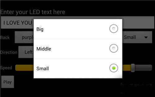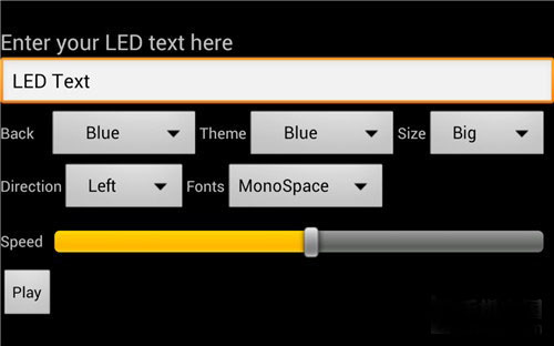LED滾屏Show只有一個菜單界面,但是可調(diào)節(jié)的地方卻很多。您可以在最上方的輸入框里打上想說的話,可以是一個名字也可以是一個口號。下面還可改變文字和背景的顏色,雖然種類不是很多,但是只要搭配得當(dāng)也能非常閃耀。
