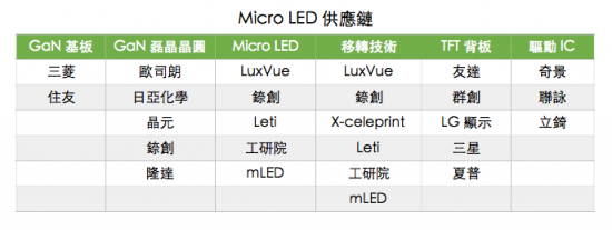 在這場Micro LED領(lǐng)域的誰與爭鋒中,中國臺灣地區(qū)不少大廠也已投入技術(shù)研發(fā),包括半導(dǎo)體新創(chuàng)公司錼創(chuàng)(PlayNitride)、臺工研院、友達、群創(chuàng)、晶電。其他也在Micro LED爭戰(zhàn)行列的國際大廠包括Sony、三星、樂金、日亞化學(xué)、夏普等,而從英國史崔克萊大學(xué)(University of Strathclyde)拆分出來的公司 mLED、美國德州理工大學(xué)(Texas Tech University)、法國原子能署電子暨資訊技術(shù)實驗室(Leti)、從伊利諾大學(xué)(University of Illinois)分拆出來的X-celeprint也都積極研發(fā)Micro LED技術(shù)。
