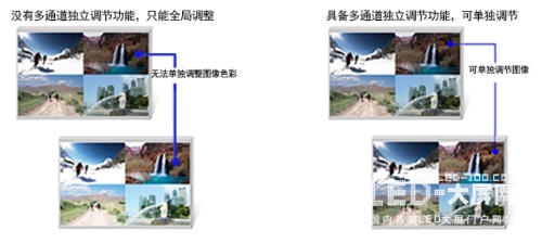 當(dāng)LCD、LED和投影等混合使用、或者信號(hào)數(shù)量很多時(shí),都可能導(dǎo)致各圖像之間顯示效果有很大的差異,你無(wú)法單獨(dú)調(diào)節(jié)個(gè)別有差異的圖像。多通道獨(dú)立調(diào)節(jié)功能可以輕松解決這個(gè)難題。它能有針對(duì)性的進(jìn)行圖像處理,使整體畫面更加和諧統(tǒng)一。