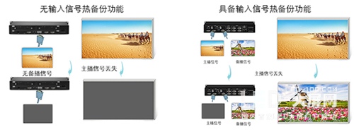 LED視頻處理設(shè)備在現(xiàn)場(chǎng)活動(dòng)的應(yīng)用越來(lái)越多,當(dāng)你正在聲色俱全的講述一個(gè)項(xiàng)目時(shí),突然發(fā)生某個(gè)故障使主播信號(hào)消失,那么現(xiàn)場(chǎng)肯定將陷入尷尬的局面。擁有智能熱備份功能,我們可以給主播信號(hào)指定多路備播信號(hào),當(dāng)主播信號(hào)發(fā)生意外時(shí)丟失時(shí),備播信號(hào)可以立即傳送到led顯示屏上,保證畫面正常顯示,也有效保障現(xiàn)場(chǎng)的可靠性。