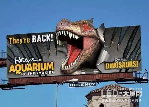 一只巨大的恐龍破“屏”而出,3D的戶(hù)外廣告視覺(jué)效果非常震撼逼真。試想一下如果3D+led顯示屏應(yīng)用于戶(hù)外廣告,其逼真生動(dòng)、栩栩如生的畫(huà)面是不是更酷呢!