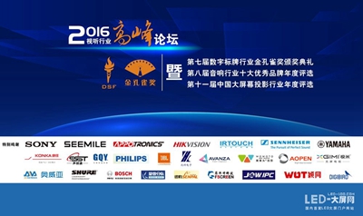 這一天,由中投傳媒、DS-360數(shù)字標牌網(wǎng)主辦,中國投影網(wǎng)、中國視聽網(wǎng)專業(yè)版/民用版、led大屏幕網(wǎng)、音響網(wǎng)、舞臺燈光網(wǎng)、廣電設(shè)備網(wǎng)協(xié)辦的“視聽行業(yè)第七屆高峰論壇暨2016年度金孔雀頒獎”在深圳圣廷苑酒店隆重舉行。來自全國各地的行業(yè)500位精英翹楚匯聚一堂,共話行業(yè)發(fā)展趨勢,見證企業(yè)加冕行業(yè)最高榮譽。
