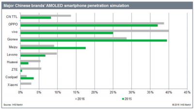 IHS指出,中國智能手機制造商(見上圖)的強勁需求,主要是Oppo和Vivo,增加了對AMOled顯示屏的需求。再加上SDC的供應(yīng)短缺,為中國的新OLED制造商創(chuàng)造了機會。2016年第二季度,這些中國OLED制造商生產(chǎn)了約60萬片面板,本季度的產(chǎn)量實現(xiàn)翻番。