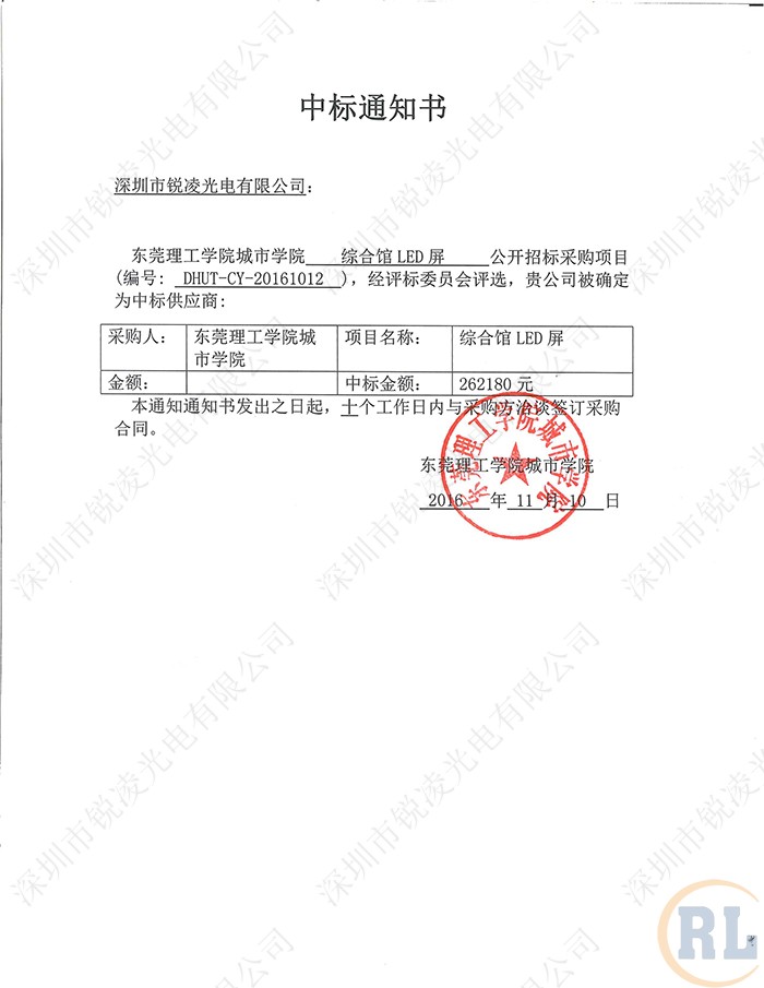 而此次成功中標(biāo)東莞理工學(xué)院城市學(xué)院綜合館LED屏項目,是銳凌首個得到周邊城市中標(biāo)通知書,此次成功案例,將會成為其開啟周邊城市中標(biāo)率的一把鑰匙,讓銳凌的品牌影響力更深遠(yuǎn)。