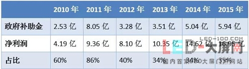 三安:從三安2010—2015年歷年報(bào)告來(lái)看,三安領(lǐng)取的政府補(bǔ)助金逐年增多,不過(guò)凈利潤(rùn)也逐年增多,政府補(bǔ)助金占凈利潤(rùn)的比例有所下降,近三年維持在35%。由此表明三安在政府多年的扶持下已經(jīng)逐漸成熟,盈利能力穩(wěn)步增長(zhǎng)。