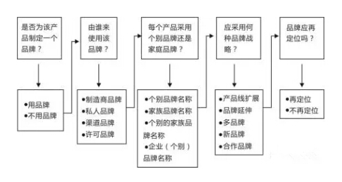 建立品牌是當(dāng)前許多企業(yè)的目標(biāo)之一,而有效建立品牌則需要一個(gè)完整的品牌策略來(lái)協(xié)助。品牌策略是一系列能夠產(chǎn)生品牌積累的企業(yè)管理與市場(chǎng)經(jīng)營(yíng)行銷(xiāo)方法,包括4P與品牌識(shí)別在內(nèi)的所有要素,品牌決策流程如下: