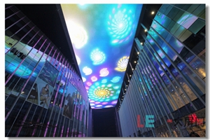 LED天幕,就是利用現(xiàn)代光學(xué)顯示技術(shù)和先進(jìn)的LED研發(fā)生產(chǎn)技術(shù),把成千上萬(wàn)顆的LED(發(fā)光二極管)組成一個(gè)可以顯示視頻、圖像、文字等信息的圖文顯示設(shè)備。它吊裝在建筑物的天花頂上,起到渲染、裝飾、亮化效果。一般適用于高檔星級(jí)酒店大堂、大型shopping mall、商業(yè)步行街、城市中心廣場(chǎng)、大型舞臺(tái)等大型建筑天花頂上,面積大、重量輕、形狀各異。