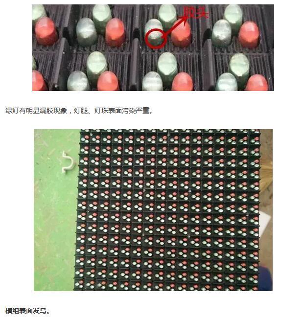 3、顯示屏(P10 全彩直插 )綠燈漏膠現(xiàn)象嚴(yán)重,燈腿、燈珠表面污染嚴(yán)重,整屏出現(xiàn)色差大、花屏等不良現(xiàn)象。導(dǎo)致該顯示屏無法提供正常的廣告業(yè)務(wù),嚴(yán)重影響了廣告商的利益。