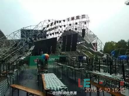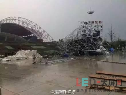 而這場絢麗的裝飾,并沒有逃脫暴風(fēng)雨的厄運(yùn)。此次事故的原因是因?yàn)楸╋L(fēng)雨天氣以及舞臺(tái)租賃背景屏搭建鋼架 結(jié)構(gòu)不夠穩(wěn)固造成的。