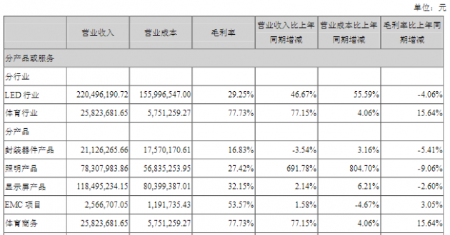 據(jù)公告顯示,報告期內(nèi),LED光源器件實現(xiàn)主營業(yè)務收入20,234.92萬元,較上年同期增長8.95%,其中:直插式LED和電視背光模組實現(xiàn)較好的增長;憑借持續(xù)推進的大客戶營銷策略、中高端的市場定位、可靠的產(chǎn)品質(zhì)量、定制化的服務及新的增量細分市場的布局,LED光源器件整體毛利率達到25.61%,較上年同期上升2.43個百分點。