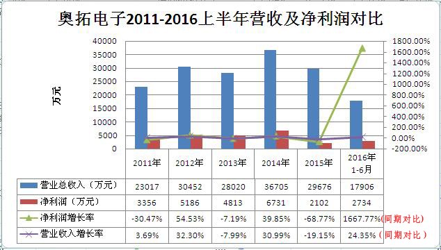 奧拓電子2011-2016上半年營收及凈利潤對比