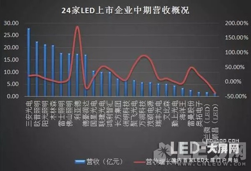 仔細查閱發(fā)現(xiàn),這24家LED企業(yè)中半年度營收下滑的企業(yè)僅4家,其中雷士照明下滑0.54%,德豪潤達下滑16.89%、澳洋順昌下滑6.69%和海洋王下滑3.01%。