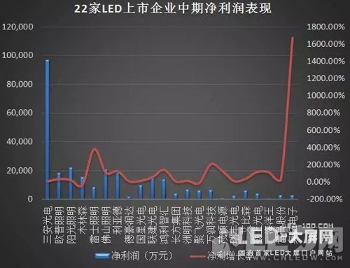 注:1.圖表中只收錄了部分LED上市企業(yè)中期業(yè)績;2.圖文中所述凈利潤為“歸屬于上市公司股東的凈利潤”;3.圖文中所統(tǒng)計士蘭微和澳洋順昌的營收只是其LED業(yè)務(wù)營收,非全部業(yè)務(wù)營收。