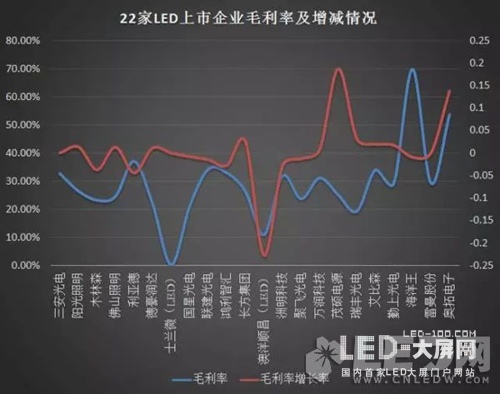 從除雷士、歐普之外的22家LED企業(yè)的毛利率及其增長情況來看,上半年LED的企業(yè)整體毛利率集中在20%-30%的區(qū)間內(nèi),有個別像海洋王這樣特種照明的企業(yè)明顯偏高。而且從整體的毛利率增幅來看,超過50%的企業(yè)毛利率是呈現(xiàn)下滑的趨勢,而對于增長的企業(yè),其實大多數(shù)的增幅都是較小的。