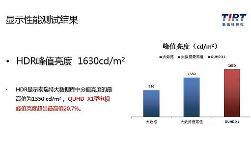 由于量子點(diǎn)顯示材料的優(yōu)越性,對(duì)于顯示設(shè)備的色域、亮度、對(duì)比度等顯示效果也有一個(gè)巨大的提升。以TCL QUHD量子點(diǎn)電視為例,據(jù)國(guó)家廣播電視產(chǎn)品質(zhì)量監(jiān)督檢驗(yàn)中心(泰瑞特)發(fā)布的權(quán)威報(bào)告顯示,QUHD各項(xiàng)產(chǎn)品指標(biāo)大幅超過(guò)普通液晶電視,尤其是色域覆蓋率(DCI-P3)是大數(shù)據(jù)庫(kù)中的最高值、峰值亮度超越行業(yè)平均水平77.9%、色彩亮度超越行業(yè)平均水平26%,這有力地證明了量子點(diǎn)顯示技術(shù)的優(yōu)越性。