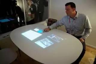 “交互式桌面”,顧名思義就是可以跟桌子進(jìn)行互動(dòng),其實(shí)是一個(gè)以投影儀與動(dòng)態(tài)追蹤傳感器結(jié)合的產(chǎn)物。投影儀將圖案投射在平整的桌面上,然后動(dòng)態(tài)追蹤傳感器可以實(shí)時(shí)監(jiān)測(cè)手指的位置,并將手指點(diǎn)擊、滑動(dòng)、觸摸的工作反饋到處理器當(dāng)中去,然后處理器將手指的動(dòng)作反饋給投影儀,然后你就可以看到你的雙手可以在桌面上操作任何東西,就好像一塊超大屏幕的平板電腦。